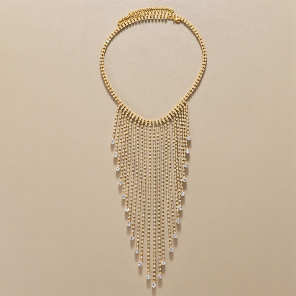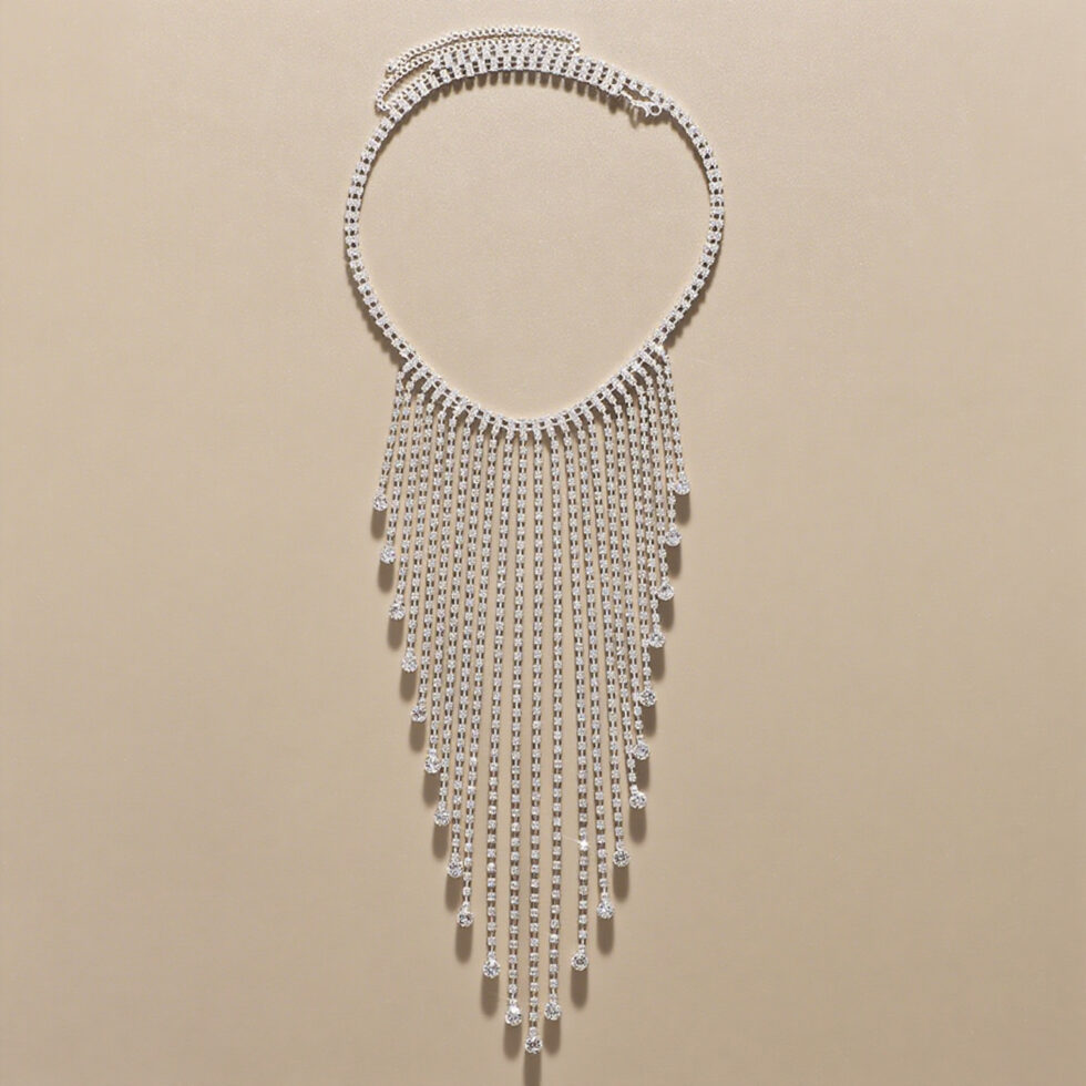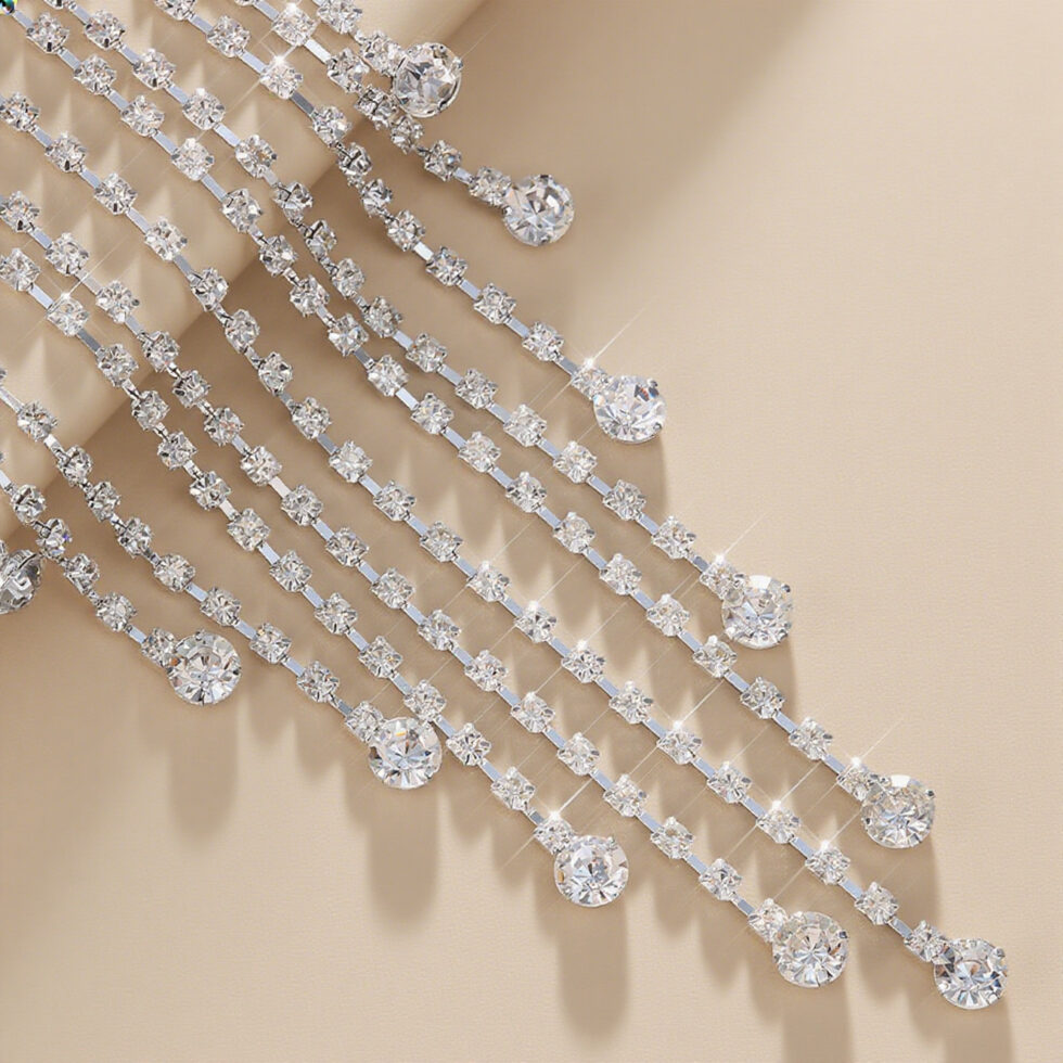 Add sparkle and movement to fashion collections with this irregular fringe rhinestone body chain. Designed with shimmering rhinestones and layered metal chains, this waist chain creates a striking statement look perfect for nightlife, beach styling, and festival fashion.