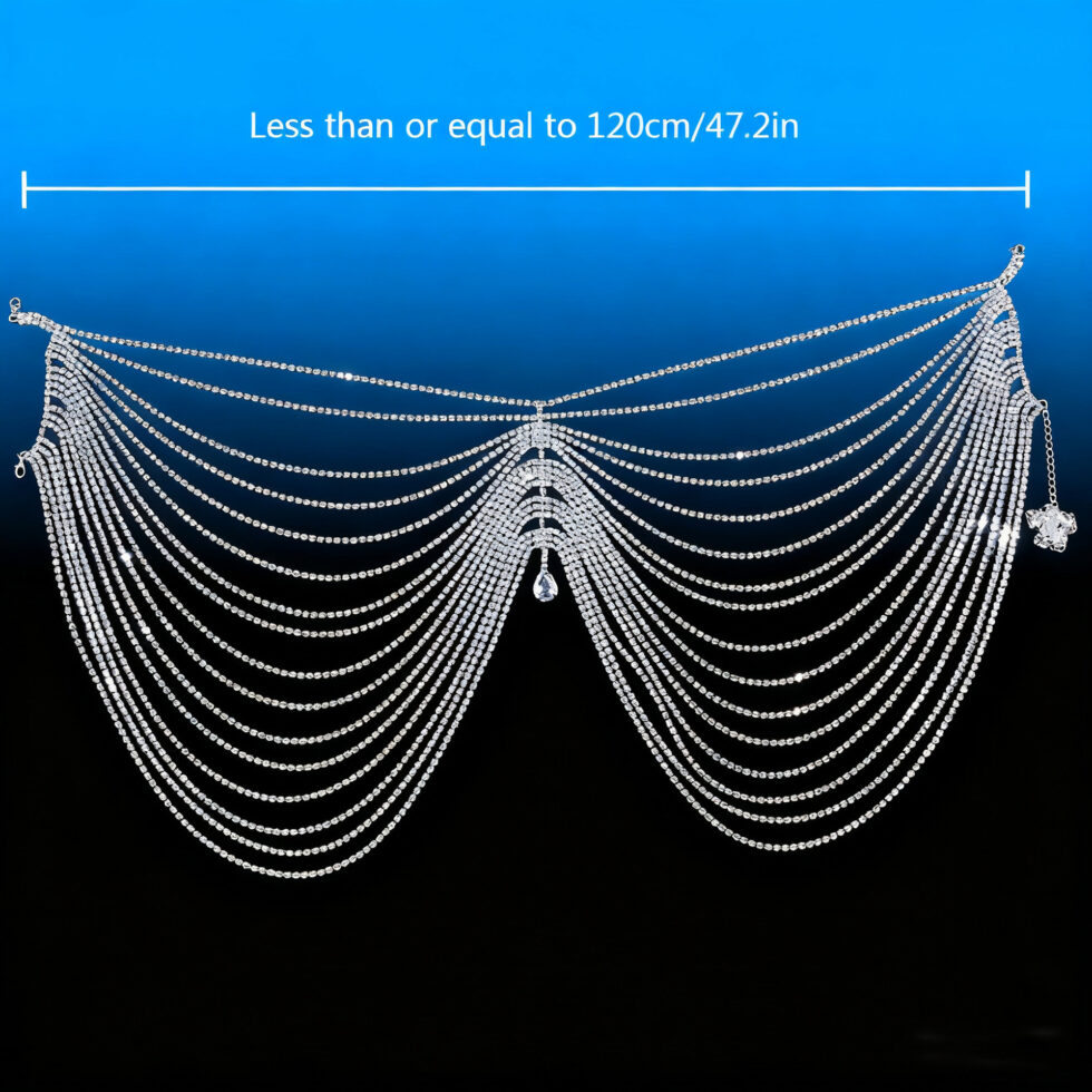 This sexy multi-layer waist chain features brilliant rhinestones and a layered chain structure that creates an eye-catching sparkle. Designed to complement dancewear, club outfits, and beach fashion, the accessory enhances body curves while adding glamorous shine.