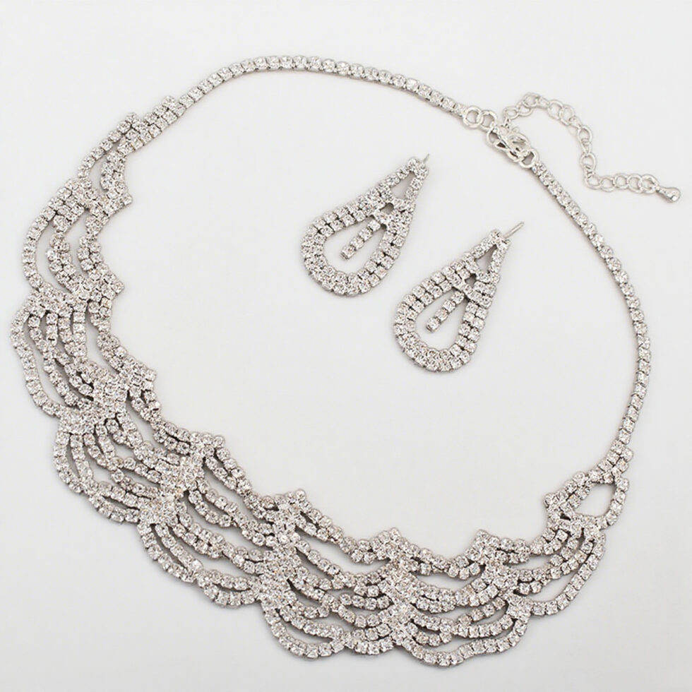 Elegant wave-inspired rhinestone jewelry set designed for bridal, banquet, and modern fashion styling. Factory-direct from China with OEM/ODM customization and bulk supply support.