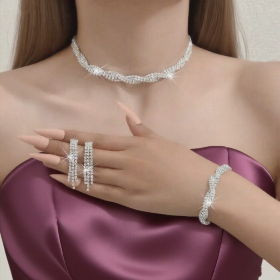 The set includes a matching necklace, bracelet, and earrings, crafted with high-clarity crystal stones in a secure claw setting to maximize brilliance and durability. The design balances classic bridal elegance with modern fashion appeal, making it suitable for multiple markets including weddings, engagement parties, proms, and evening events.